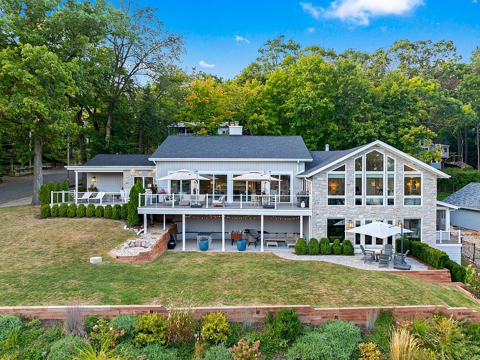 Impressive 4 bedroom, 3.5 bath home located directly across the street from Geneva Lake and just 3 doors from the expansive Knollwood Association park and sand swimming beach. Living room with fireplace, wet bar, vaulted ceilings and access to the spacious deck facing the lake. Bright open kitchen with center island, skylights and stainless appliances, adjacent pantry and laundry. Family room with second fireplace, main floor primary suite with full wall of windows facing the lake and deluxe bath with dual vanities, soaking tub and tile shower. Walkout lower level features second kitchen, bunk room, full bath, large screened porch, recreation room facing the lake with access to lower level paver patio and covered outdoor game area. Spacious yard, attractive landscaping, 2.5 car garage.