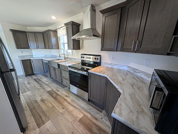 Here's your chance to own a NEW 2025 manufactured home! This modern 3 bedroom 2 bathroom home sits on a slab with insulated skirting at the end of a private road. The home features an open concept living with a master bedroom and bathroom on one end and two bedrooms on the other side. Appliances include dishwasher, refrigerator, microwave, oven with range hood, washer, and dryer. A carport and shed are also included. No real estate conveyed. Come see it today!