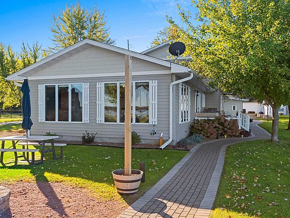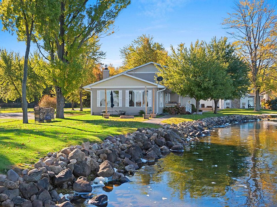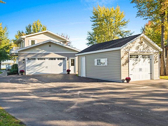 Welcome to your dream lake home! Nestled on 180 ft of water frontage, this beautiful home offers year-round enjoyment on a full recreational lake – perfect for boating, swimming, fishing, and snowmobiling all year long. Relax at your private sandy-bottom shoreline, ideal for wading and swimming, along with a custom dock ready for your boat or lake toys. Enjoy breathtaking sunsets and lake views from windows throughout the house. Inside features a cozy gas fireplace, built-ins, tongue and groove pine ceilings, and a modern kitchen with granite countertops. The long driveway offers privacy, and a second garage provides plenty of extra storage for all your needs. This fully furnished home is your perfect all-season getaway. Don't miss your chance to own a slice of paradise!