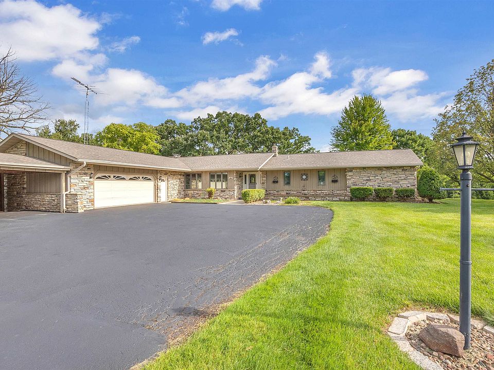 Beautiful 3.3-acre property bordering DeNeveu Creek with partially wooded lot- camp in your own backyard and enjoy an abundance of wildlife! Main level features 3 spacious BRs, office & 1.5BAs. Large LR showcases beamed ceilings, floor-to-ceiling stone accent wall w/gas fp- seamlessly flowing into the dining area & kitchen. Additional highlights: 1st floor laundry & family room w/new carpeting. Primary suite has WI closet & patio doors that open to a private covered deck overlooking the beautiful scenery! Lower level is perfect for entertaining: 2nd family room w/fp, new flooring, large den w/new drywall, updated full bath, & rec room complete w/wet bar. This desirable location and expansive lot present a rare opportunity not to be missed!