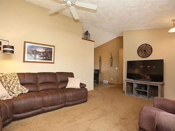 Enjoying your backyard retreat in comfort on this massive covered patio! This outdoor entertaining space features stamped concrete, granite countertops, built-in grill, and cabinet storage. Watch the big, game in style, host a gathering, or just sit back and relax with plenty of room for seating. Step inside to be welcomed by the volume ceiling great room with large front bay window. Tucked behind the great room is the fully renovated eat-in kitchen with updated soft close cabinets, granite counters, tile floors, deluxe stainless steel appliances, and walk-in pantry. Sliding doors from the dinette lead to the back patio that overlooks the massive landscaped yard. Adjacent to the great room you will find a common full bath, two large bedrooms, and a master suite with private bath. Additional features include: 3 car attached garage heated and insulated, full unspoiled basement, vinyl windows, HUGE oversized .42+/- Acre lot, backyard storage shed, concrete curbing, and much more!