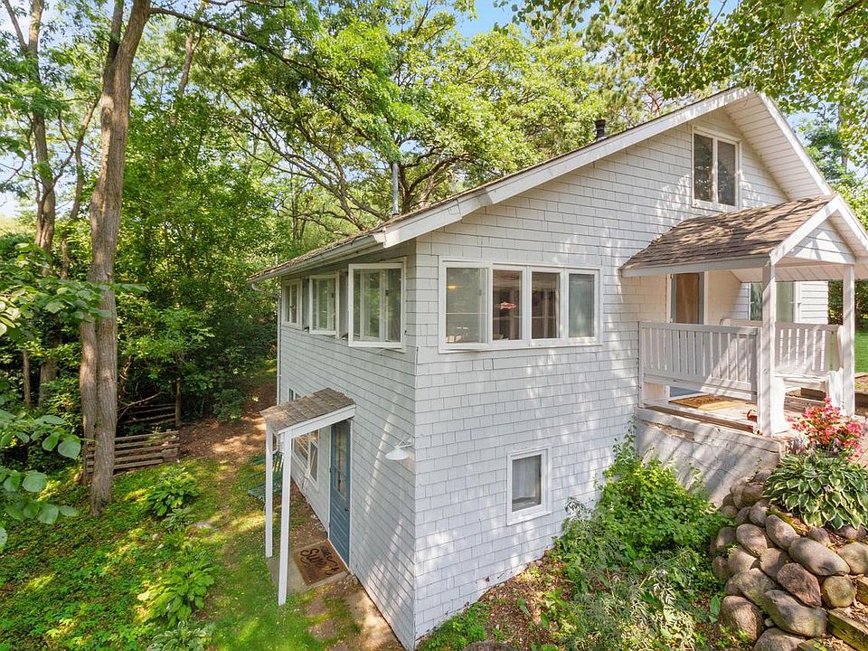 Charm is oozing from this cottage with views of Lauderdale's Green Lake from your private deck perched on a wooded hill. The tree top views instantly relax you as you embrace nature. Massive 3 season room off the deck is sure to be a favorite spot to enjoy your summers at the lake. The main level of the home has hardwood floors and a stone fireplace for cold winter nights. Just off the great room is the bedroom. The kitchen overlooks the large dining and sitting rooms with a wall of windows. A powder room is also on the main level. The recently renovated attic space has a secure ladder that leads to a bunk room with 4 built-in beds and 2 nooks perfect for the kids. The stairs off rear of home lead to the shared common beach and swim pier. The seller rents a separate pier for their boat.