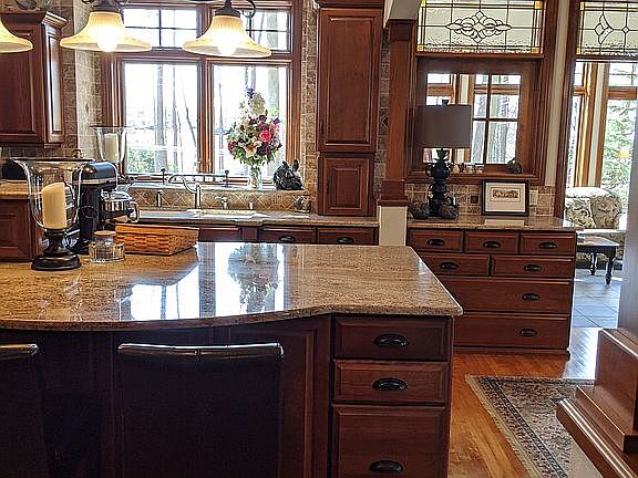 This is an all brick home on a double wooded lot in the Kimberly School District. The home has 4 bedrooms, and 4 1/2 bathrooms. The home features granite counter tops, cherry cabinets, red birch hardwood floors, ceramic tile, two gas fireplaces, and a wet bar. The first floor features a beautiful kitchen with double ovens, lots of built-in cabinets, pantry, and a large island, an office, formal dining room, master bedroom suite. The second floor has a tv sitting room, 2 bedrooms and a one-bedroom suite with a full bath and a bonus room over the garage. The lower level features an exercise area, custom built bar (play and craft area known as the Black Cat Cafe to the Grand Kids) and lots of room to relax and entertain. The 3-car heated garage has over sized doors, commercial grade epoxy floor, cabinets, work bench and a separate access to the lower level. There are no private covenants or Homeowner’s Assoc. There is room to build a 900 square foot detached garage.