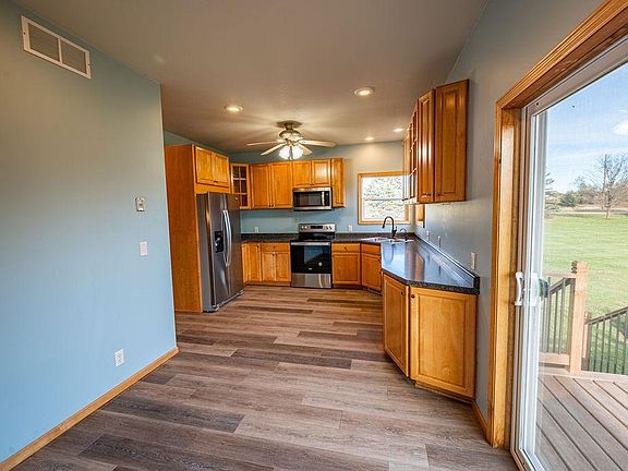 This beautiful home is located just outside of town in a nicely developed neighborhood. Large Living Room with vaulted ceilings up to 18', ceiling fan and two picture windows overlooking front porch/yard. Dining Room with chandelier is just off the living room area with a large picture window overlooking big back yard. Kitchen was just fully updated with maple cabinets, new countertops, all new stainless steel appliances, ceiling fan along with recess lighting. Informal Dining area or option for a coffee bar located between the Kitchen and Dining Room with sliding doors to new 12x12 Deck. All new vinyl plank flooring and carpet throughout the entire home for a nice fresh look! Three Bedrooms on upper level including Master Bedroom and Bath with tile surround jacuzzi tub, separate shower as well as a large walk-in closet of the Master Bath. Four apple trees ready for picking! Level 2.4 acres of yard outlined with mature trees and a fire pit for your enjoyment!
