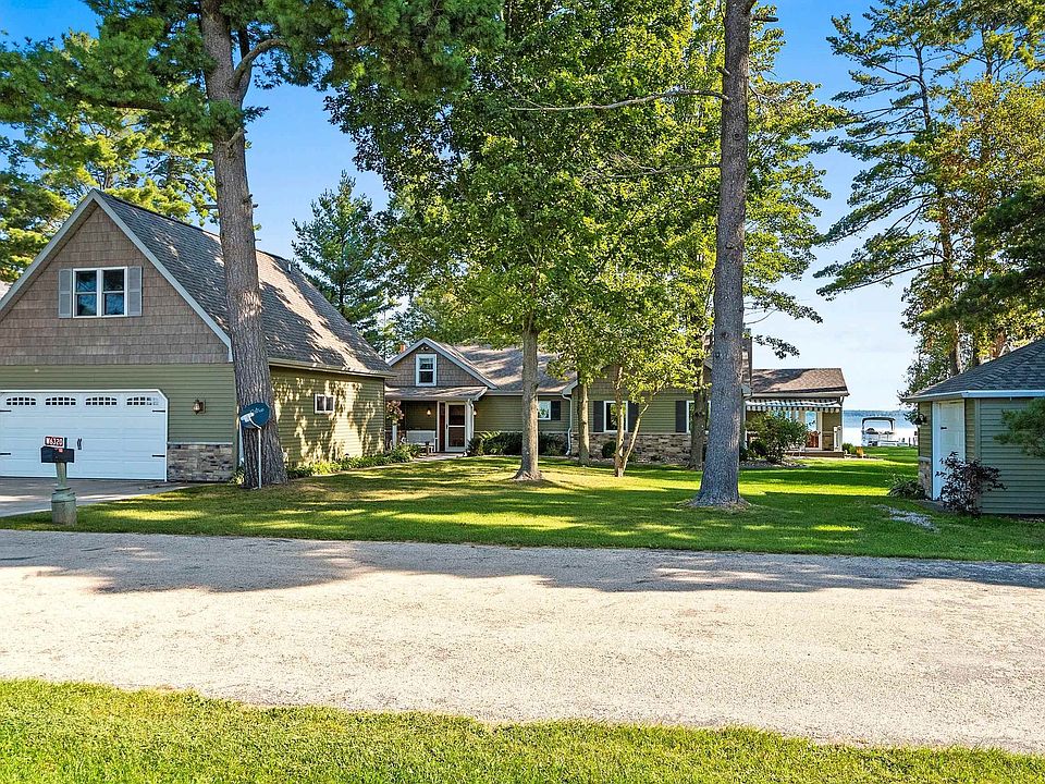 This luxury year-round 4 bed/2bath waterfront home is a must see! With breathtaking, open concept cathedral ceilings, fireplaces, a stunning sunroom, large dining room & kitchen all overlooking the big prize, 101 feet of pristine Shawano Lake sand frontage! Among the list of amenities, this pristine beauty also has a floor to ceiling stone fireplace, in-floor heat, in-wall speakers, rear deck & front deck with a retractable awning, cypress flooring, Italian look tiling, hickory cabinets & LED under cabinet lighting. The detached garage house's the overflow of guests as this offers a full bath with a stunning 320sf bunk house above the garage! All of this with Shawano Lake, Washington Lake & the Wolf River at your back door! Absolute serene living, welcome home! *PreAppr required to show*