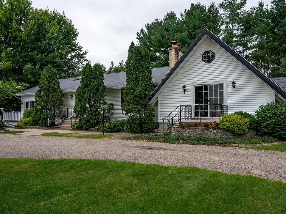 4 bedroom home with primary suite. 2500 sq ft. on 3.75ac. In the town of Necedah. Home is laid out for entertainment. The great room is at one end of the house with Cathedral ceiling, skylights, and Gas fireplace. Windows are facing wooded scenery, bringing nature to you. Formal dining room in the middle of house separating kitchen and Office/den/sitting area with wood fireplace and patio doors looking out to the circle driveway. Multiple entrances into home. Two wells serving property; 1 for house, 1 for 6-zone sprinkler system watering garden area. 2 car detached garage with workshop space added on back with 200amp + 1 car Det gr. Home is well cared for on a Seclude lot on the village & township boundaries. Natural gas, Fiber optics in the works -TDS.