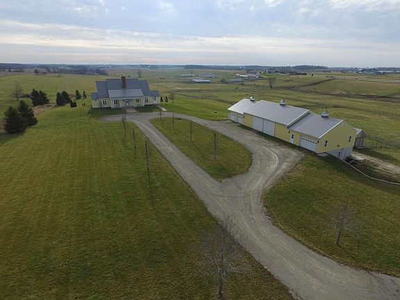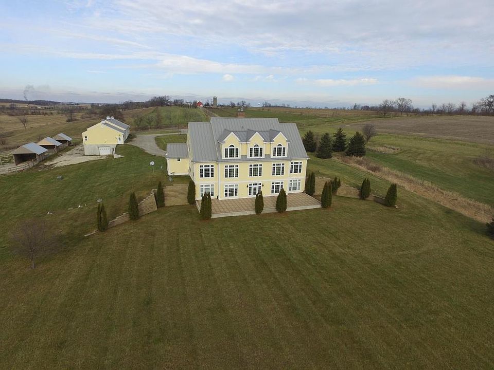 Elegant estate home on over 100 acres has the charm of a southern plantation home with the yellow exterior & metal roof, inside the white wainscoting, crown molding, & 2-story great room. Beautiful granite tile floors throughout, sunroom with a wall of windows with southern exposure overlooking the countryside. Master suite is a separate wing of the home that has a spacious bedroom, HWFs, private bath, & private den. Walk-out LL features a 2nd kitchen, 4 bedrooms, & 2 full baths. Practically every room features window seats & BIBC, sconce lights, & wainscoting. Beautiful property!