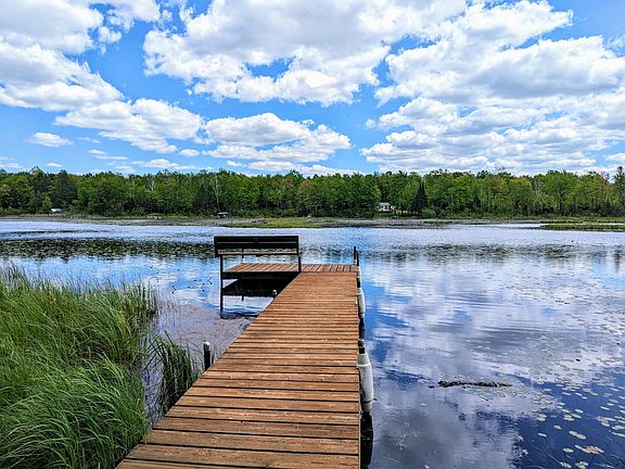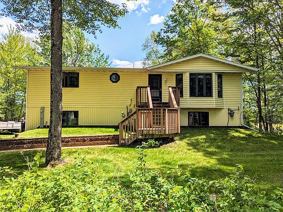 If you’re looking for peace and privacy on water…this might just be ‘the one.’ This property offers 2 lots, with 200’ of frontage and 3 mostly wooded acres. This 2 BR 3 BA raised ranch with tuck under 2 car garage is well kept, has an open feel and spacious rooms. The kitchen has hickory cabinets, coffee bar and island, and the dining area has a French door to the lakeside deck. The 2 bedrooms on the main floor are roomy with large closets, and the Master has a private bath. The lower level offers the ideal space for family and friends, a third big bonus room, bath with shower, and living room with 2 sets of French doors to the lakeside patio. This property offers direct access to the ATV and snowmobile trails, ski trails, and is across the road from 1,000s of acres of public land, and just down the road from Solberg Lake County Park, with sandy beach and boat launch. There is a 24x40 detached garage and a 12x16 shed, so you will have plenty of space to store your toys!