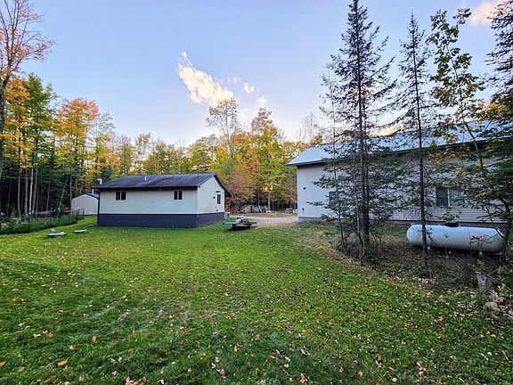 Here is a year round 2BR-1BA cabin nestled on 10 heavily wooded acres with direct access to 1,000s of acres of public land. The cabin is well-built and meticulously maintained. The open concept living area features cedar tongue and groove, beautiful hickory kitchen cabinets, and bedrooms with pine tongue and groove. The modern bathroom includes a walk-in tiled shower, adding a touch of elegance to the rustic setting. Outside, the property features cherry trees, blueberries & honey berries. A spacious 30x40 detached garage also awaits, equipped with in-floor hydronic heat, plumbed with water, and a loft area with a pool table-perfect for entertaining or relaxing after a day of adventure. Outdoor enthusiasts will appreciate being located on ATV route and access to local snowmobile trails. The acreage is all high ground with balsam and a mix of hardwoods. Whether you seek a peaceful getaway or an active lifestyle, this cabin is the ideal escape in the heart of the Northwoods'.