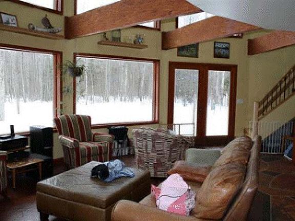 (122)Enjoy this unique 4 BR, 2.5 bath, Deltec home that has been constructed with energy efficiency in mind along with an eye to quality. It currently is listed with 10 acres and there is an additional 116.5 acres available. The property borders a huge block of public land where you will have direct access to snowshoeing, hiking, horseback riding, ATV, and snowmobile trails. There are 17' ceilings, custom kitchen with hickory cabinets, freestanding wood fireplace, wood and stamped concrete floors, and countless windows to enjoy the private wooded view. The master suite has a private patio, mahogany cabinets with a double vanity, and a champagne tub to relax in. The upper loft has 3 bedrooms, full bath, and a rec. room for the children, which even includes a magnetic wall. There is an attached garage along with a 22'x50' detached garage with in-floor heat that also includes a 30' loft. A landscaped yard includes a large garden with raised beds along with stamped patios.