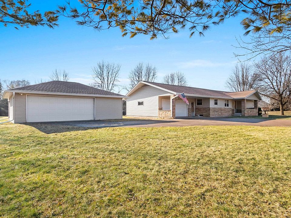 Mid-Century Modern Gem on 1.3 Acres! Nestled on a sprawling lot, this property offers endless possibilities. The home's coved living room ceiling, wood-burning fireplace, and newer flooring create a warm and inviting atmosphere. Two spacious bedrooms with corner windows provide natural light. The generously sized kitchen awaits your customization. A main-floor den can easily be transformed into a third bedroom, accommodating your evolving needs. Abundant closet space ensures organized living. The lower level, complete with a daylight window and a newer wood-burning stove, presents endless opportunities for finishing. A 2nd heated 30x22 garage is a dream come true for hobbyists. With a newer roof and mid-century modern design, this home is a true gem. Please allow 48 hours for offer review.