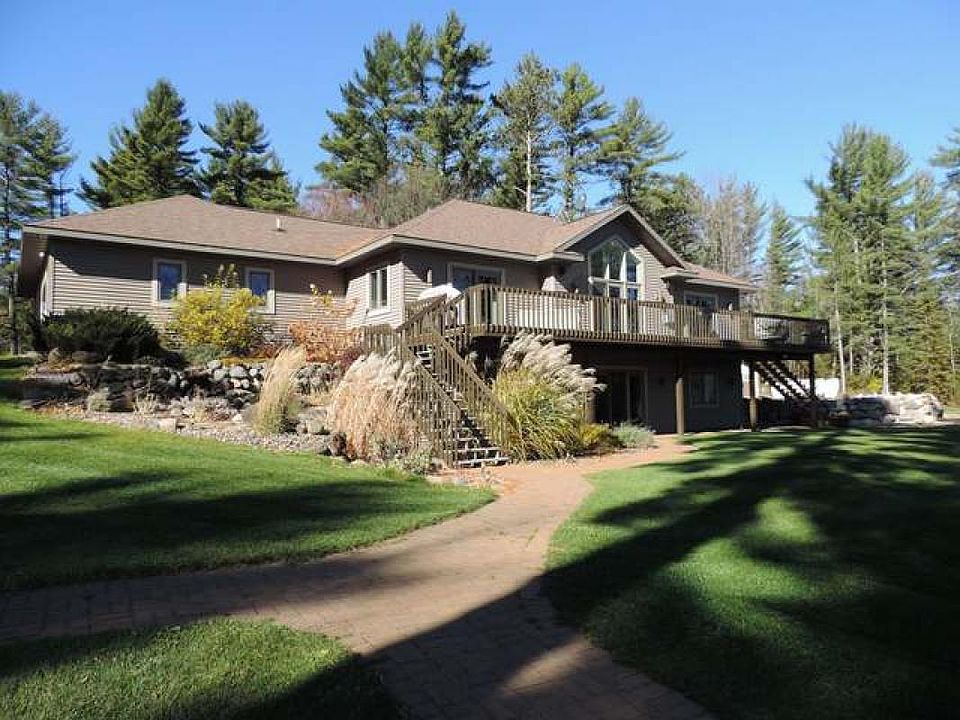 Gorgeous Maintenance free exterior, 3 bedroom, 3 bath ranch with walkout lower level located on the beautiful Spirit River Lake. With 2.6 acres and 417 ft. of level sand water frontage all professionally landscaped not to mention the incredible in ground swimming pool. Entertaining at this home will be a breeze! View the pool and the lake from the lakeside deck that leads from the sizable and bright kitchen and dining room. The master bedroom also overlooks the lake, finishing out the main level is the huge great room with fireplace, bedroom and the main floor laundry. The lower level consists of a large bedroom, spacious rec room complete with bar area, exercise area and 2 other rooms for any extra use you may have. Other Amenities include newer tankless water heater, attached 2 car garage, central a/c, in ground sprinkler system,Waterfall, Shed,Boat Track System,Hot Tub, Fire Pit, Roll in Dock, Swim Raft & much more. This is a quality home for a great price! See it today!