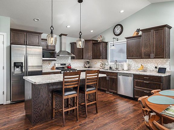 Better than new construction, this 2017 built walk-out ranch sits on a .64 acre lot with bluff and golf course views. The open concept main level features vaulted ceilings and luxury vinyl floors that flow throughout the entire home. Gorgeous kitchen with a large island, pantry, stainless appliances, and a glass mosaic backsplash. The primary suite includes a massive walk-in closet and a private bath with dual sinks. Two additional bedrooms share a full bath with another double vanity. The walk-out lower level includes a spacious family room, two large bedrooms with walk-in closets, a full bathroom, and ample storage. Main floor laundry is conveniently located off the heated garage with epoxy floors. Wonderful outdoor space includes a deck, patio, a flat back yard, and nice landscaping.