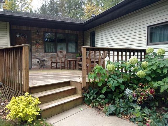 First time offering! This custom home offers 238 feet of meandering sandy shoreline on the Phillips Chain of Lakes with a location minutes from downtown, with direct trail access. The lot is level, wooded with mature trees, and is well landscaped. There is a vegetable garden and loads of perennials, with a small nature walk with a sitting area. The lakeside patio offers great space and has a gas line for the grill, with an easy walk to the shore and fire pit. Once inside, you will love the cozy feel and thoughtful floor plan. The Great Room has vaulted wood ceiling, stone fireplace and lakeside bay window. The kitchen is open, has hickory cabinets and pantry, breakfast bar for entertaining, and dining area with built in cabinet. The lower level has a dry bar, built ins and plenty of space, and there is also a lower level bonus room, bath, storage room, new furnace, and workshop with a wide staircase to the garage. If you are looking to live on the Phillips Chain, this is a must see!