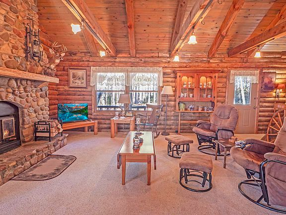 Enchanting log home on 5 wooded acres. Set back on a dead end rd w/ spectacular views of woods and meadows. Quality log construction boasting a massive fieldstone fireplace, cathedral ceilings, & open kitchen. Additional family rm, full bath, washer dryer & primary bdrm complete the main floor. Upstairs you'll find a bright/cheery loft w/ample storage and large window to draw in the sunlight. Back off main floor, the lower level offers a family rm, bedroom, & full bath. Lower level is completed w/ attached 2 car garage and workshop. Outside there is a perennial garden & 24x24 shed for all your toys. Five acres are wooded, teeming w/deer... paths throughout just need a little TLC. Additional 5 acres available! This prop is ideal for FT home, weekend retreat, or a vacation rental property!