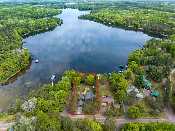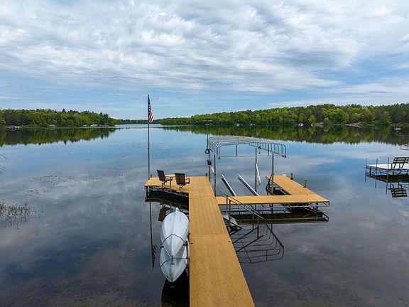 Enjoy lakefront living with this beautiful 5-BR / 3-BA chalet-style home on sought-after Dunn Lake. Featuring low elevation frontage, this open-concept home offers vaulted ceilings, a spacious kitchen with Cambria countertops, cozy stone fireplace, and a bright three-season room with added windows. With bedrooms and a bathroom on each level, it's ideal for hosting family and friends. The finished lower level includes a large family room and rec space—perfect for entertaining or relaxing. Enjoy the outdoors with a large lakeside deck complete with TimberTech decking and aluminum railings, stamped concrete fire pit area, fun 14x16 ft lakeside bar, and a beautifully landscaped park-like yard. The 25x25 ft newly finished garage and 10x16 ft lakeside storage are perfect for your gear. Dunn Lake is known for its peaceful waters—ideal for swimming, fishing, boating, or simply enjoying the call of loons. Nearby ATV and snowmobile trails make this a year-round retreat. Sold mostly furnished!