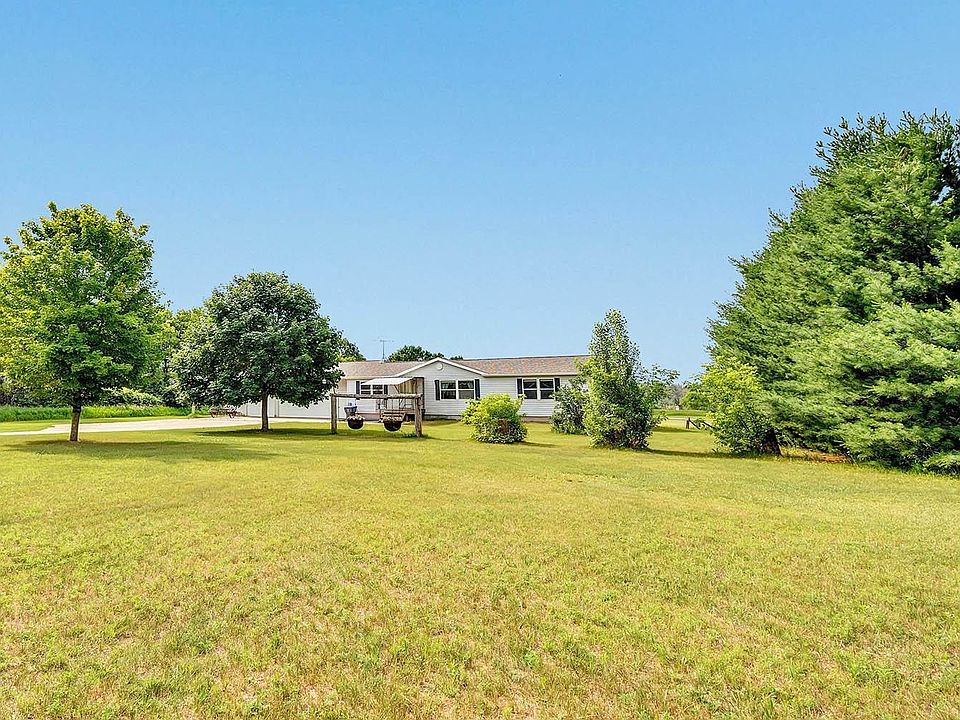 Ranch home situated on 6.13 quiet country acres in a serene setting w/wooded tree line. Open concept living room features vaulted ceiling & large picture window for natural light. The applianced kitchen features an abundance of storage, center island w/upper cabinet & adjoining dining area w/glass doors to the relaxing deck accented by a screened-in gazebo w/ceiling fan overlooking the expansive yard. Main level primary bedroom offers a walk-in closet & private bath with walk-in shower, soaking tub & skylight. There are 2 additional main level bedrooms. Both have walk-in closets & one offering a second closet. Laundry area is also on 1st floor. Washer & dryer are included. Heated drive-through garage. Yellow lines on picture are approximate.