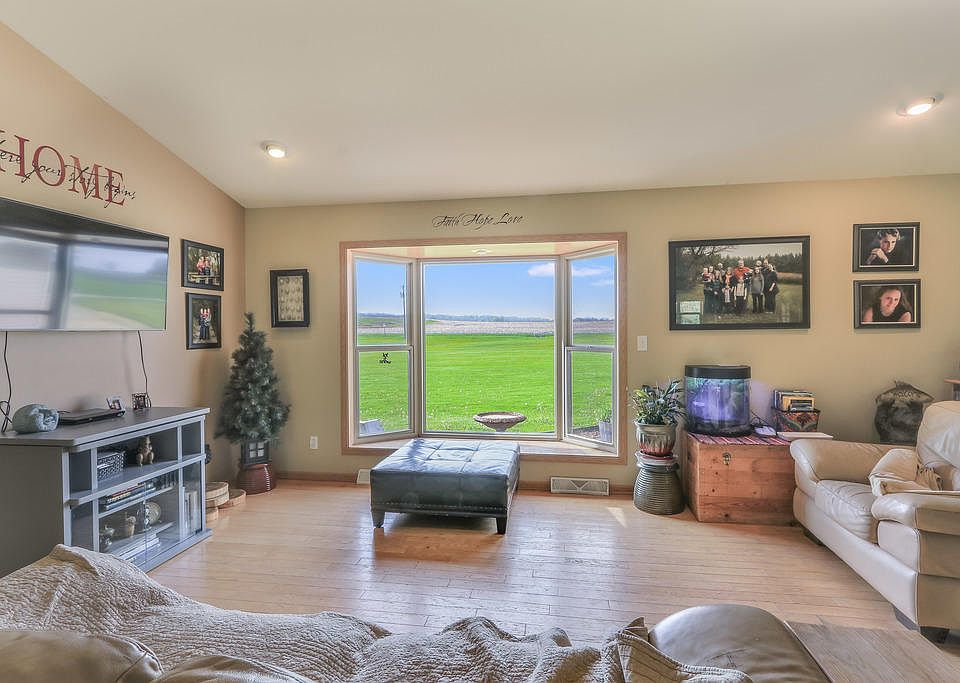 Newer Ranch home on 5.24 acres with sweeping countryside views! Open concept design, cathedral ceilings. Oak HW floors. Large Bay Window. Main floor laundry and separate mud room. Master Suite has large walk-in closet and spacious bath. SS GE appliances and Whirlpool W/D. Central Vac system. Horses allowed. Property goes beyond trees in back. Covered porch can be screened in or made into a 3-season room. NEW shed. LL rec room, 2 bdrms and 3rd stubbed bath are 75% finished. Drywall, electric, HVAC are in place. Needed is paint and carpet. Finishing this will add an additional 1760 sq ft of living space and make this a 5 bdrm and 3 bath home! Garage door was replaced with a window and garage is currently being used as a craft room. Framing still in place to put overhead door back in.