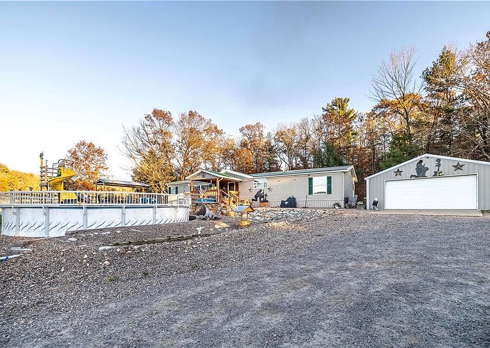 Up North -Bring the horses! This spacious three-bedroom, two-bath manufactured home, with over 2300 sq. ft. Built in 2003,steel roof (2014), Elevated on 16-inch piers, enjoy country living with an included 40x80 pole shed featuring a workshop and recreation room, a 30x40 three-sided shed for horses, pasture, and an above-ground pool with a slide on a deck. Nestled on 60.61 acres, this property offers an outdoor enthusiast's paradise with hunting and ATV access at your doorstep. These owners purchased with a VA loan. The house sits on (40) 16 inch Piers that are 8 feet deep. Easement to neighbor cabin in back. The outbuildings have 2 x 6 purlins in the roof structure, extra thick gauge of steel, hundred amp, electric, and water in the shop. The septic is a three tank at grade system. Approximately 30 acres are fenced.