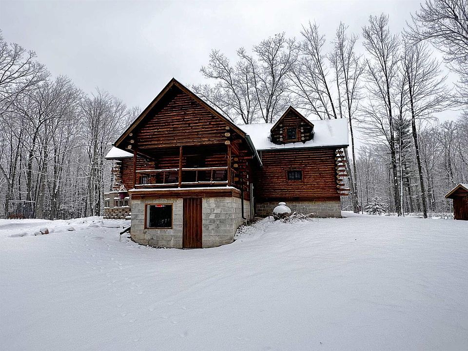 WELCOME TO SERENITY WITH THIS EXTRAORDINARY PROPERTY OFFERING PRIVACY, BREATHTAKING VIEWS, AND AN ABUNDANCE OF NATURAL BEAUTY ON 12 ACRES OF PRISTINE LAND. This secluded oasis features a stocked and aerated pond, surrounded by wooded areas, providing an idyllic setting for nature enthusiasts and those seeking a peaceful retreat. With two distinct homes on the property, this listing offers versatile options for a large family or additional income through rental opportunities. The main residence is a full log home with a metal roof. Inside you will find vaulted ceilings and skylights along with hardwood floors that exude rustic charm. As you step inside, you'll be captivated by the walk-around loft that offers a unique and spacious feel to the entire home. The sitting area boasts a woodburning fireplace, perfect for cozy evenings and gatherings. The main floor living room features an electric fireplace and leads to a balcony to relax and unwind. The kitchen comes equipped with modern appliances, ensuring convenience and efficiency.,The main residence comprises three bedrooms, with the primary bedroom situated on the upper level, ensuring privacy and tranquility. Two additional bedrooms are located on the main floor, providing ample space for family members or guests. A full bath with granite countertop complements the main living area. The lower level of the house presents the opportunity for customization, with an unfinished space ready to be transformed according to your preferences and a full bath. A finished detached garage/shop is heated with new furnace. This versatile space boasts a bar area and an upstairs bonus room, presenting opportunities for various uses such as a workshop, hobby area, or entertainment zone. From the patio overlooking the pond, you can indulge in moments of relaxation while enjoying the serene atmosphere. The property also includes a second home accessible by either trail or the driveway. This home offers further versatility with a tuck-under garage/shop and a new furnace installed in 2022, ensuring comfort and efficiency. The main living area of the second home gives a cozy feel. The layout encompasses three bedrooms one bath, a kitchen, and a living room area. As with the main residence, the second home boasts a backdrop of trees, making it an inviting space for residents and guests alike. Beyond the homes, the property provides excellent opportunities for hunting, recreational activities, and connecting with nature. Enjoy exploring the land, spotting wildlife, and immersing yourself in the natural wonders that surround you. Don't miss out on this rare opportunity to own a slice of paradise with endless possibilities. Serenity awaits you. Contact us today and schedule a tour to experience this remarkable property firsthand. Included - Refrigerator (3), Stove/Oven (2), tv mount & tv, garage bar *The measurements/features apply to main home.