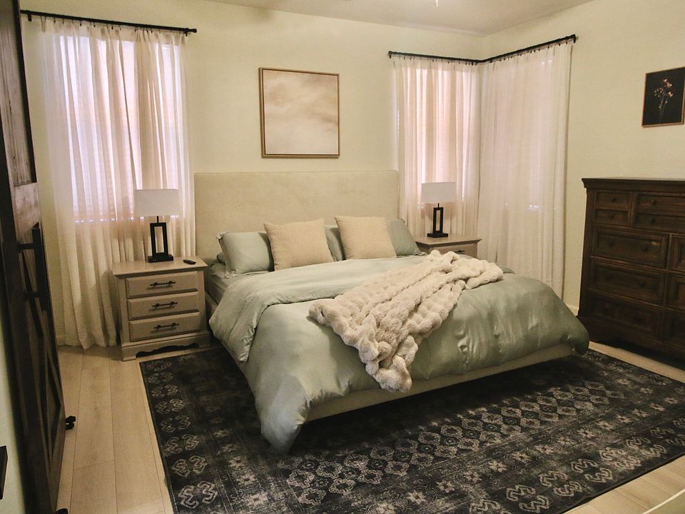 Rent the master bedroom in our beautiful home with a private pool and hot tub. The house has 3 bedrooms total. The master suite includes an ensuite bathroom and walk in closet. The bedroom is fully furnished with a TV. There is also an office to use with gym equipment like a Peloton and weights. The kitchen is chef ready, fully equipped to cook healthy meals including an Instant Pot, air fryer, Keurig, and all essentials.. Newly updated with granite countertops, wood floors, and mid-century modern interior design. The dining area seats 8 perfect for entertaining or meetings. The living room boasts a large, comfortable leather couch with a 65" smart TV and built in surround audio. Fast WiFi is included throughout. The backyard is resort style. Relax with our private pool and hot tub, outdoor dining, grill, and pool toys a true desert retreat. Garage has 2 parking spaces and a dedicated level 2 plug for electric vehicles. Located minutes from White Tank Mountain hiking trails and stunning sunsets. 10 minutes to major shopping & dining: Target, Costco, Walmart, and more. Near top-rated hospitals, medical centers, and growing tech corridors. Compared to local Phoenix and surrounding cities, Waddell is a hidden gem in the West Valley, Waddell offers a quiet, family-friendly atmosphere with quick access to major freeways, Luke AFB, Goodyear, Glendale, and Surprise, and a booming healthcare and tech sector ideal for winter travelers, military families, corporate travelers, healthcare professionals, and relocating families.