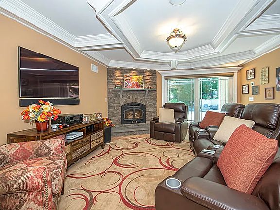 Cozy family TV room with surround sound, heated vibrating recliner chairs, and fireplace