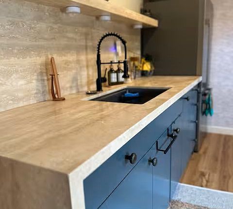 Fully stocked galley kitchen with travertine countertops and full size refrigerator.