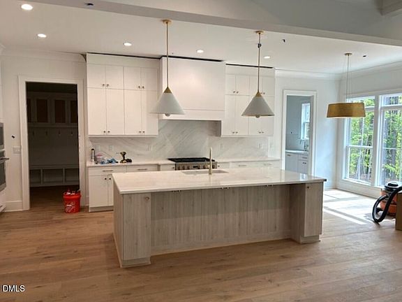 Custom built by Wardson Construction on a 1+acre pool ready lot on a private cul-de-sac! Located just 10 minnutes to popular downtown Wake Forest and only 5 minutes to shopping and dining! Upgraded trim, designer lighting end elegant finishes throughout! Wide plank hardwoods span throughout the main living areas! Main level primary suite and dedicated study! Gourmet kitchen: offers quartz countertops and riser, custom white painted stacked cabinets to ceililng with under cabinet lighting, custom stained islandtopped with quartz and designer pendants, stainless steel appliance package and large scullery/prep area! Formal and informal dining areas. Primary suite: features tray ceiling with crown, hardwoods and luxurious en-suite bath with dual vanity with quartz top, vanity cabinets and linen tower, freestanding tub, spa-style tile to ceiling surround shower with frameless glass and walk-in closet with his and sides! Family room: with painted ceiling beams, white tile surround fireplace with flanking built-in cabinets with shelving above and 4-panel slider door to the covered porch with painted brick fireplace! Upstairs recreational room with wet bar and custom wainscoting, exercise room with additional storage space and 3 private en-suites! Additional features include 3rd floor walk-up attic with huge storage space, 3-car garage, tankless water heater and only county taxes!