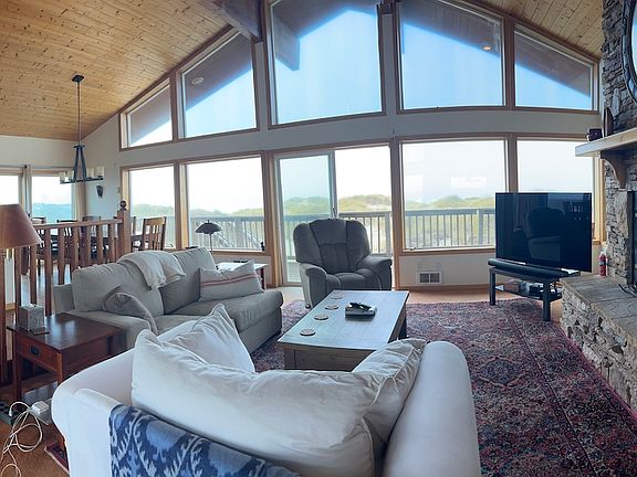 Views, views, views! From morning to night, enjoy views from the East (the Alsea river and bridge) to the West (the Pacific Ocean) with beachfront views from the main living area and the primary bedroom. Bathed in natural light from multiple skylights and a wall of windows, the open floor plan allows seamless flow between the living room, dining area, and kitchen. The airy, vaulted ceilings and river-stone fireplace set the stage for relaxed gatherings with plenty of room for you to spread out. Step off your balcony onto the sand dunes for your daily walk along the beach and fall asleep to the lullaby of crashing waves. Located in the Bayshore neighborhood, the home provides instant beach access to miles of sandy shoreline. You'll also benefit from community amenities such as a seasonal, heated pool, workout equipment, and clubhouse (with guest fee).