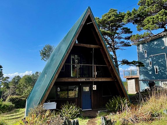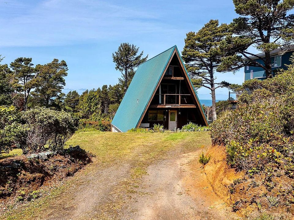 Welcome to the fabled Oregon coast. Featured in Portland Monthly, this ocean view A-frame cabin is nestled between the quaint coastal towns of Waldport and Yachats, where the forest meets the sea. This A-frame was built in 1971 by the Kimball Brothers Lumber Company. All structural and panel lumber was handpicked from their mill in the Willamette Valley. Main floor includes a full bathroom, laundry / mud room, bonus room with closest, kitchen with newer appliances and a living/dining room with a sliding door to the deck with views of a coastal forest and the Pacific Ocean. Upstairs there are 2 bedrooms with slider access to decks and a 1/2 bath. Ocean facing second story deck has bar counter for the ultimate work from home experience and sunset cocktail. The A-frame cabin has reliable fast internet for the remote worker and is less than 25 minutes from all city amenities and pristine world-class outdoor recreation.