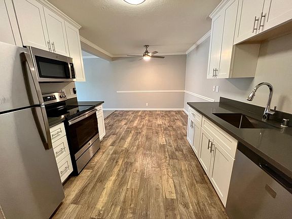 Modern brushed nickel hardwareWhite shaker-panel cabinetryElegant light fixturesQuartz countertopsStainless-steel appliancesDistressed faux-hardwood flooringPlush carpet