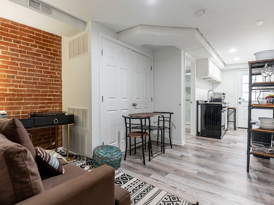 Enjoy a gorgeous view of the Capitol from your front sidewalk at this private Shaw apartment, complete with an outdoor front patio and furniture, perfect for working from home! This spacious one-bedroom unit has a dedicated entrance, fashionable exposed original brick maintaining the character of the building, lots of natural light from the oversized windows in the bedroom, pale gray flooring throughout, recessed lighting, and exposed loft-styled ducts. This unit has a private bathroom with a tiled shower and vanity. The kitchen boasts a cooking range, stove, dishwasher, microwave, garbage disposal, cabinets, and granite countertop. Full-sized washer/dryer.