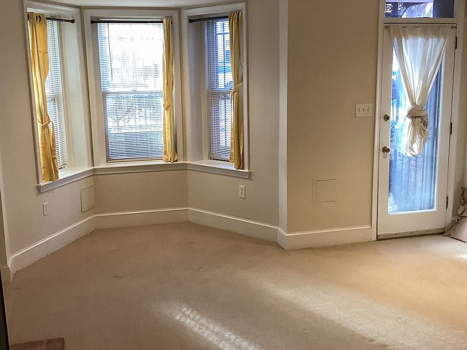 1 Bedroom, 1 Bathroom Basement Apartment: Living room w/ sunny bay window, fireplace; galley kitchen w/ dishwasher and washer/ dryer; w/carpet.