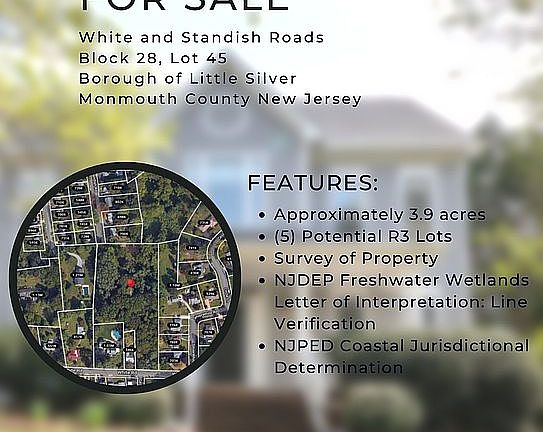 Vacant land in desirable Little Silver, NJ (Monmouth County); approximately 3.9 acres. (5) Potential Residential R3 Lots with frontage on White Road and Standish Road. Available documents upon request include: Survey of Property, NJDEP Freshwater Wetlands Letter of Interpretation: Line Verification and NJDEP Coastal Jurisdictional Determination. Private property, viewable by appointment only. Buyer's agents welcome. Accepting offers via Letter of Intent to block28lot45@gmail.com