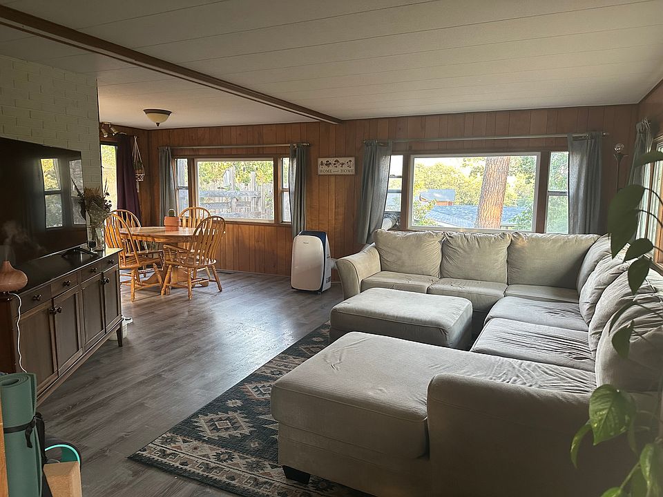 Inside, you'll find spacious living areas with big picture windows that invite in the forest light. Warm wood paneling and vintage charm meet modern updates for a space that feels both grounded and cozy.