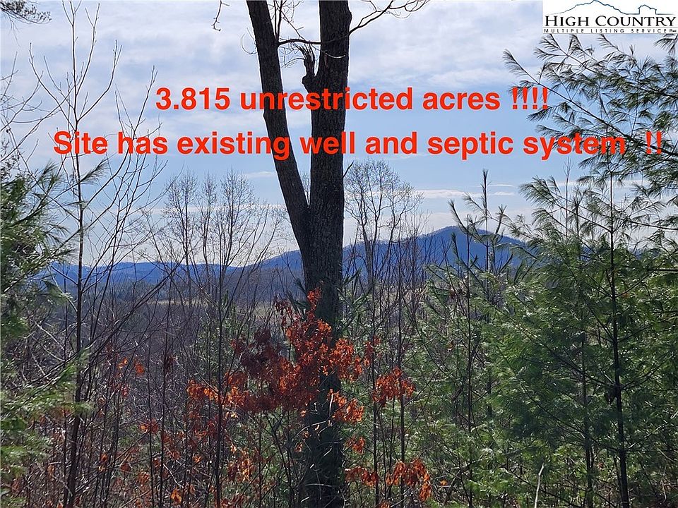 Well and Septic in place on 3.815 unrestricted acres that offers seasonal and year round views, easy access to town, a level build area that had a manufactured home in the recent past. There is a well located on lot 4 and two bedroom septic on lot 5. Lot 4 also provides a cleared area that can be used for an outbuilding, fire pit area, outdoor storage, or otherwise. This property has been recently surveyed so the property markers are easy to see. Located near Jefferson and West Jefferson but also easy travel to Virginia, Sparta, or Boone.