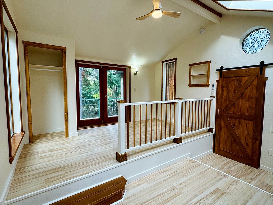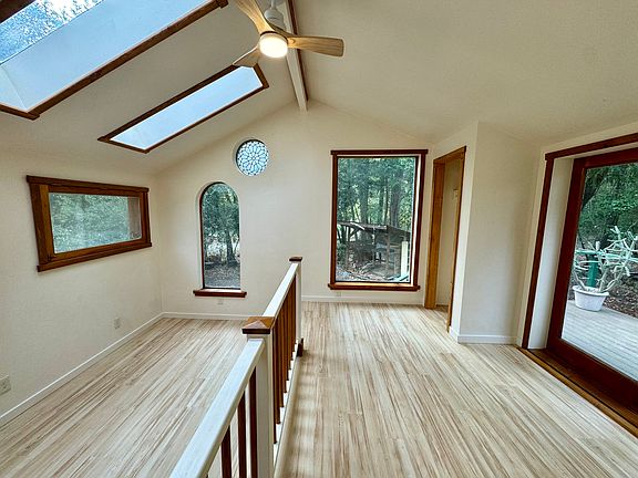 Inside, you'll find a bright and welcoming interior with two spacious bedrooms plus a versatile bonus room ideal for a third bedroom, guest room, or creative studio. The home is filled with natural light thanks to multiple skylights and floor-to-ceiling windows that bring the outdoors in.