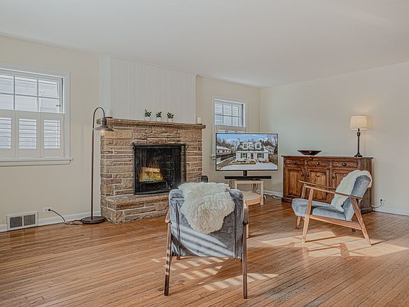 Cozy stone fireplaceClassic characterBeautiful hardwood floors