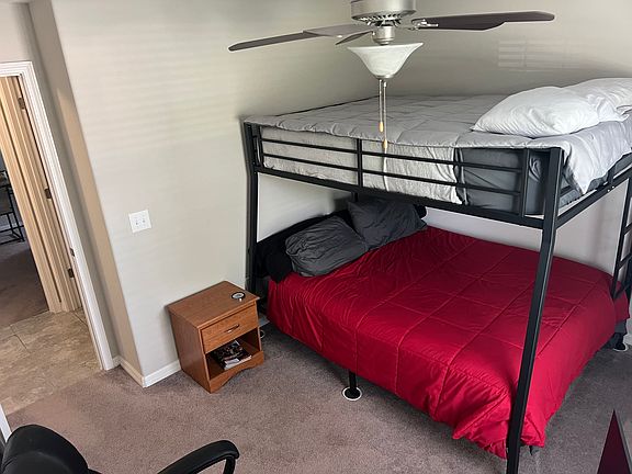 Spare bedroom one features a bunk bed with queen on bottom and full XL on top and desk with chair