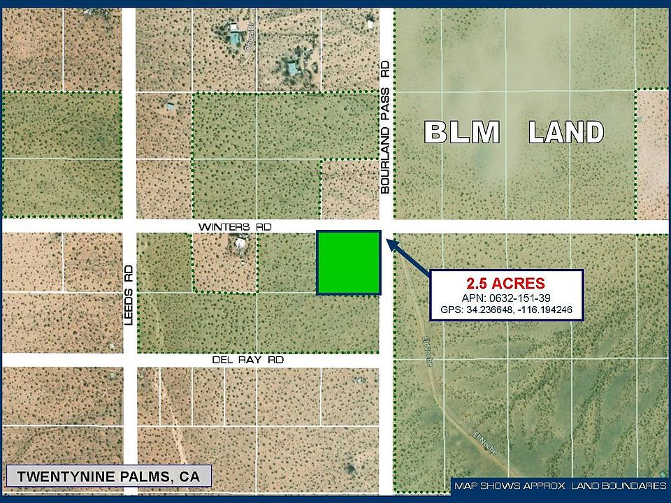 This 2.5 acre property is on the corner of Winters Rd. and Bourland Pass Rd. in the Copper Mountain Mesa area of Twentynine Palms, CA. According to the San Bernardino County this corner lot is zoned Joshua Tree Rural Living- 5 Acres Minimum. This zoning allows for rural residential and incidental agricultural uses. Small jackrabbit homestead foundation is on the property. Electricity is approx 1,030 feet west of the property. Water Meter box and connection is already installed, according to the Joshua Basin Water District the meter/connection fee would be approx $8,346.