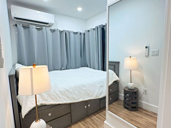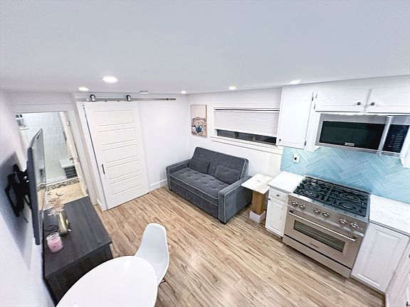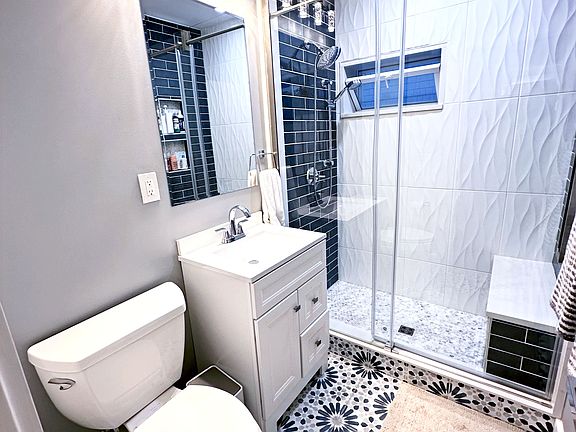 Modern & Updated: Recently renovated with a contemporary aesthetic, featuring a sleek bathroom with stylish tile work and a spacious glass-enclosed shower.