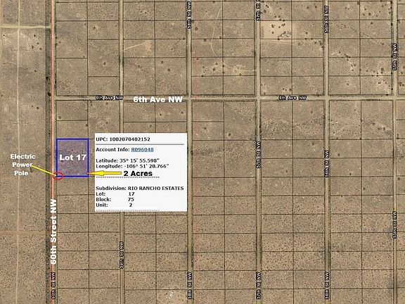 2 Full Acres with Electric Power on the land. Seclusion, Privacy and Electricity. Rare to have electric power on a very secluded property. Call Today! Thank you. . GPS is Latitude: 35 15' 55.598''Longitude: -106 51' 20.766''