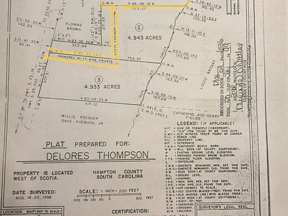 This 4.92 acre wooded parcel sits at the end of Woodrow Rd, just outside of the Scotia area and just south of Estill, SC in southern Hampton County. This tract has a platted access easement coming into the land from the south side, off of Woodrow Rd (as shown on included plat and map image). There's a small creek at the back eastern property line. There's are large mature hardwoods on a large majority of the tract, beautiful to walk around in, and potentially hunt in. This is a great area to find whitetail deer, wild turkey, or possibly even wood ducks. There's high ground on the front northwestern side of the parcel, that was previously cleared but now has some small pines growing back that could be easily mulched and cleared, if desired. This property sits at the back of a small, quiet and friendly rural neighborhood. It's primarily bordered by other larger agricultural tracts used for timber, hunting and farming. Check this property out on our direct website, truesouthland . com, for more mapping and information. Contact the listing broker for more information on it or to set up a showing, by appointment only. (c).