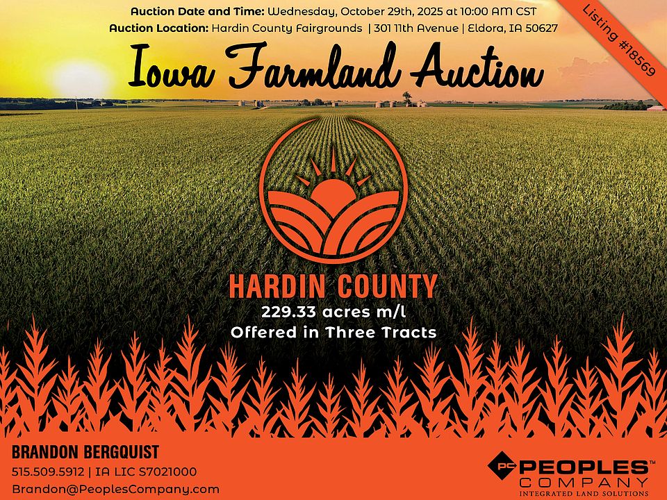 Three tracts will be offered via a live Public Auction that will take place at 10:00 AM CST on Wednesday, October 29th, 2025, at the Hardin County Fairgrounds, 301 11th Avenue, Eldora, Iowa. The land will be sold as three individual tracts using the ''Buyer's Choice'' auction method on a price-per-acre basis, and the high bidder can take, in any order, one, two or all three tracts for their high bid. ''Buyer's Choice'' auctioning will continue until all three tracts have been purchased and removed from the auction. Tracts will not be offered in their entirety after the auction. This auction can also be viewed through a mobile bidding app, and online bidding will be available.