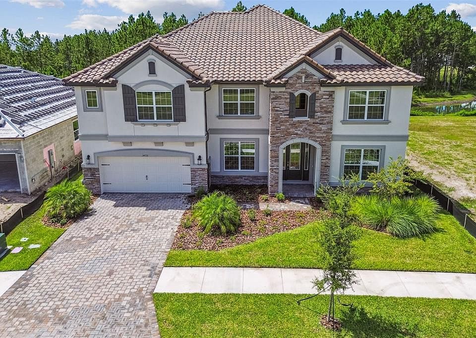 New construction home by M/I Homes in Shortgrass at Two Rivers. Popular Grandsail III floorplan, elevation D. Experience the beauty of new construction at 34526 Alger Point Zephyrhills, FL. This exceptional home, built by M/I Homes, offers 5,452 square feet of thoughtfully designed living space. This beautiful new-build home features: 6 spacious bedrooms and a den 4 full bathrooms for optimal convenience Game room and media room 47' x 8' lanai and balcony New construction with contemporary design elements This stunning 6-bedroom, 4-bathroom home provides ample space for family living and entertaining. The downstairs owner's bedroom offers privacy and accessibility, while the additional bedrooms provide comfortable accommodations for family members or guests. The heart of this home is its well-designed open-concept living space, creating a natural flow between kitchen, dining, and living areas. This thoughtful design allows for easy conversation and connection while maintaining distinct functional zones. Your gourmet kitchen easily accesses the formal dining room through the butler's pantry. As a new construction home, everything from the foundation to the fixtures is brand new, meaning you'll enjoy the peace of mind that comes with modern building standards and materials. The craftsmanship by M/I Homes is evident in every detail, from the carefully planned layout to the quality finishes throughout. The generous 5,452 square feet of living space offers room for everyone and everything, with versatile areas that can adapt to your lifestyle needs. Whether you're hosting large gatherings or seeking quiet spaces for work and relaxation, this home delivers. Located in Zephyrhills, this home puts you close to area parks while maintaining a peaceful neighborhood setting. Contact us today to learn more! *Photos shown are for representational purposes only and may not depict the actual home.