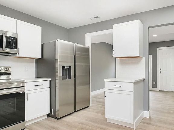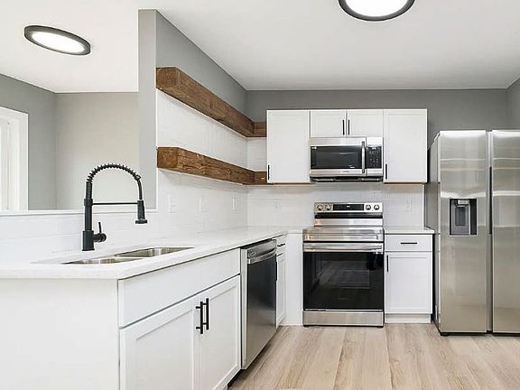 Large deckQuartz countersStainless steel appliancesWhite shaker cabinetsNew vinyl plank flooring