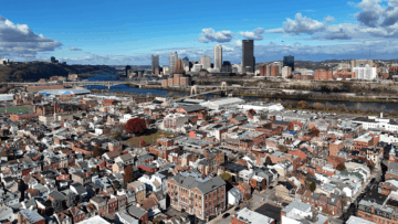 An aerial view of the South Side Flats neighborhood in Pittsburgh