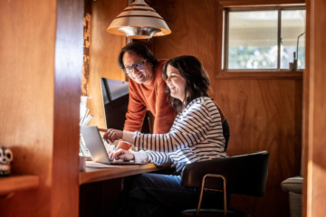 Smiling couple preparing food and using laptop to research how to shop for a mortgage without hurting their credit.