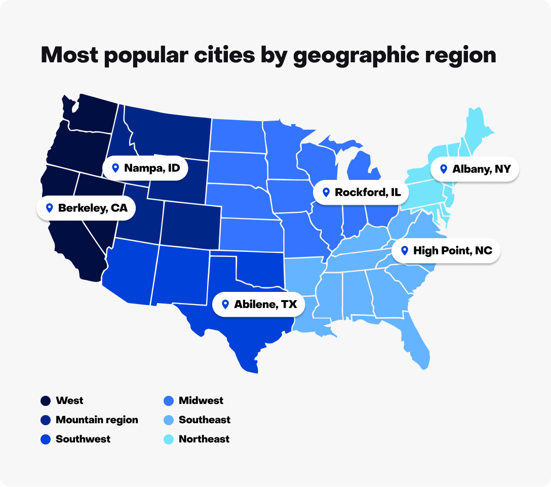 *Editor's note: To determine the most popular city overall and most popular city by geographic region, Zillow analyzed cities with a population of at least 100,000 people, according to 2023 American Community Survey data. See more about our methodology.