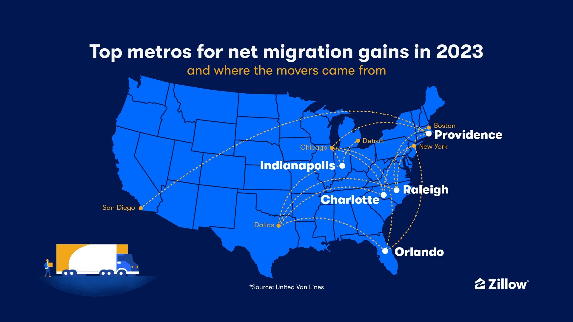 Among the 50 largest metros by population, those with the highest net in-migration from United Van Lines customers in 2023 were Charlotte, Providence, Indianapolis, Orlando and Raleigh.